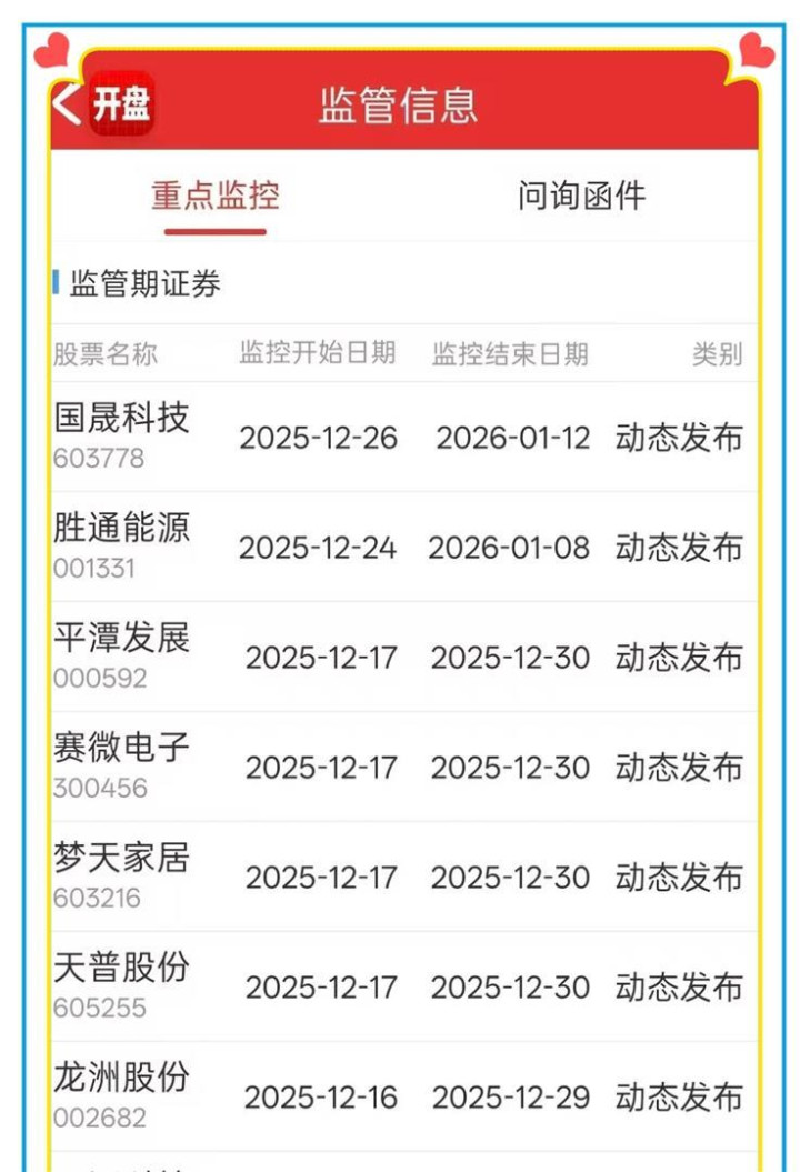 12月28日A股市场有个话题特别火:被监管层点名盯上的股票,反而更容易涨。 有人甚至总结说,“监管是妖股的通行证”。 这不,就在2025年12月27日中国证券公司前100名,深交所和上交所又公布了一批重点监控的股票名单,国晟科技、胜通能源、平潭发展等八只股票赫然在列。